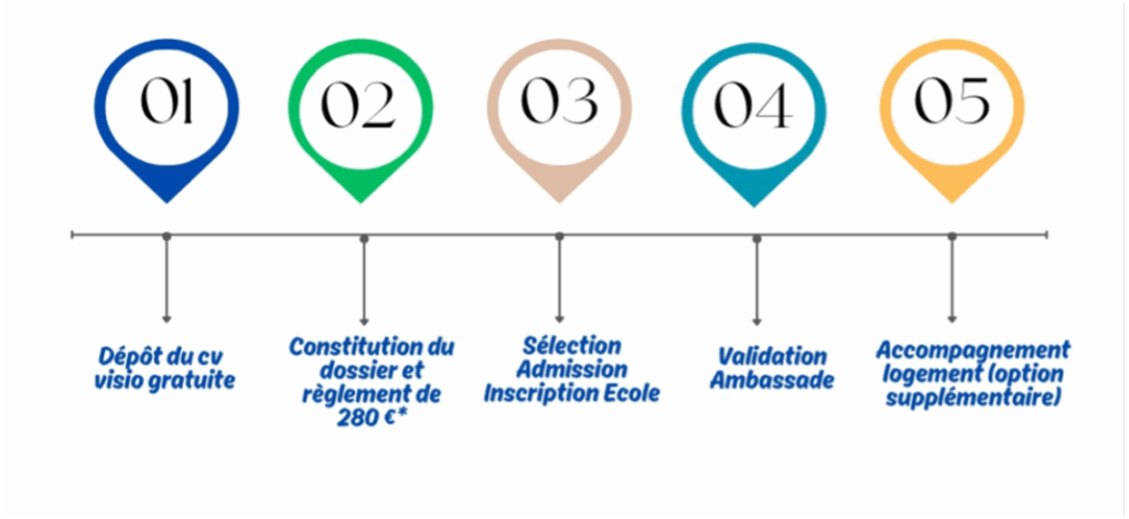 * Placement garanti uniquement si le dossier est complet, transmis dans les délais, tests d’admission réussis et visa obtenu. ⚠ Aucun remboursement des frais ne sera accordé si ces conditions ne sont pas respectées.